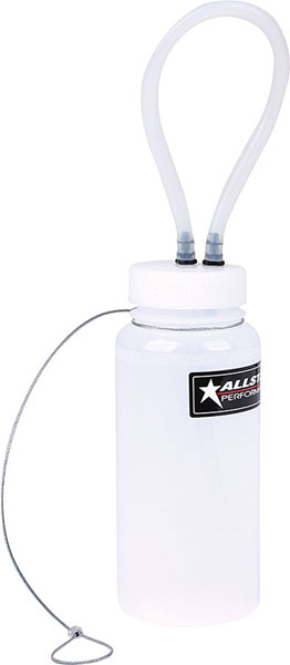Allstar Bleeder Bottle with Lanyard. 16oz bottle with 12″ long hose which attaches to most bleeder screws. Has a steel lanyard that can suspends the bottle from the chassis or suspension components.