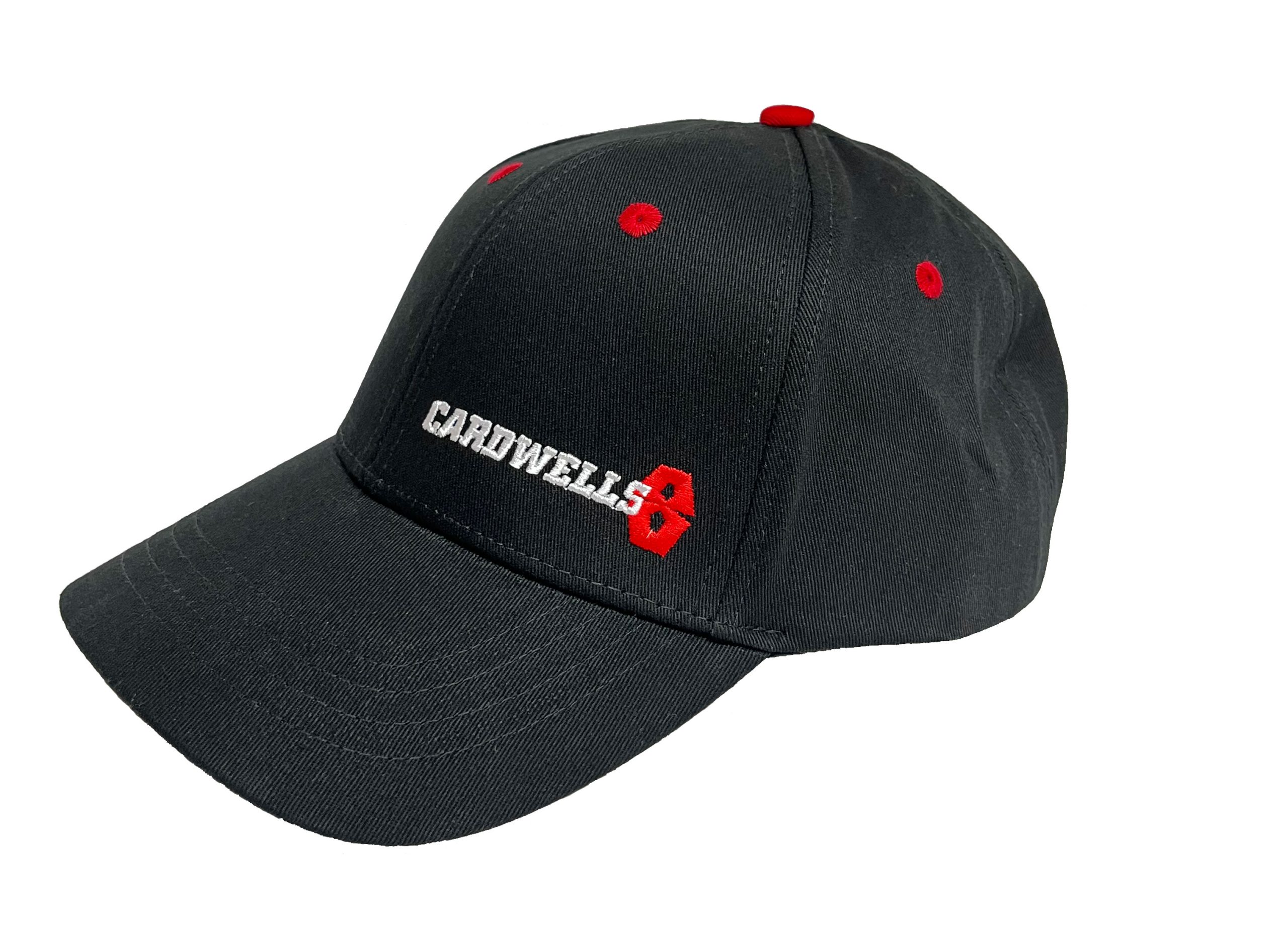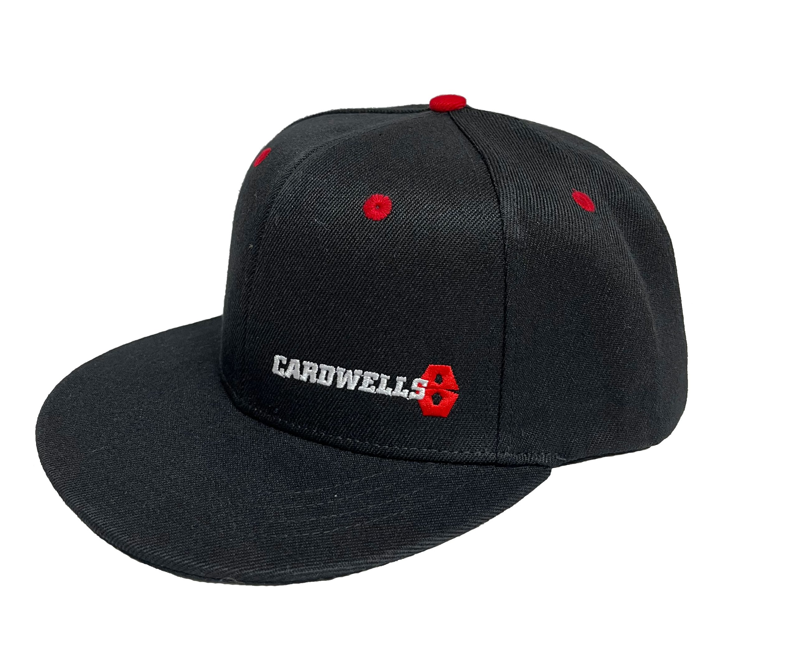 Cardwells 8 Hat. Black with red accents. Available in a Curved Peak or Flat Peak. Both options have a Red Plastic Snapback adjuster.