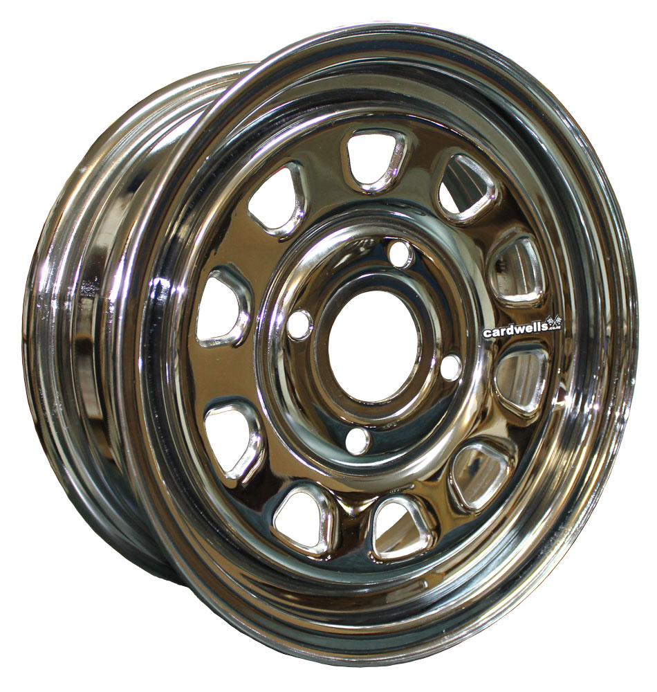 CARDWELLS DAYTONA CHROME WELDED MINISTOCK RIM SNZ/DOT Legal for Mini Stock. 13″ x 5″ +25 offset Datsun/Toyota Stud Pattern 4 x 4.5″ (4×114.3)