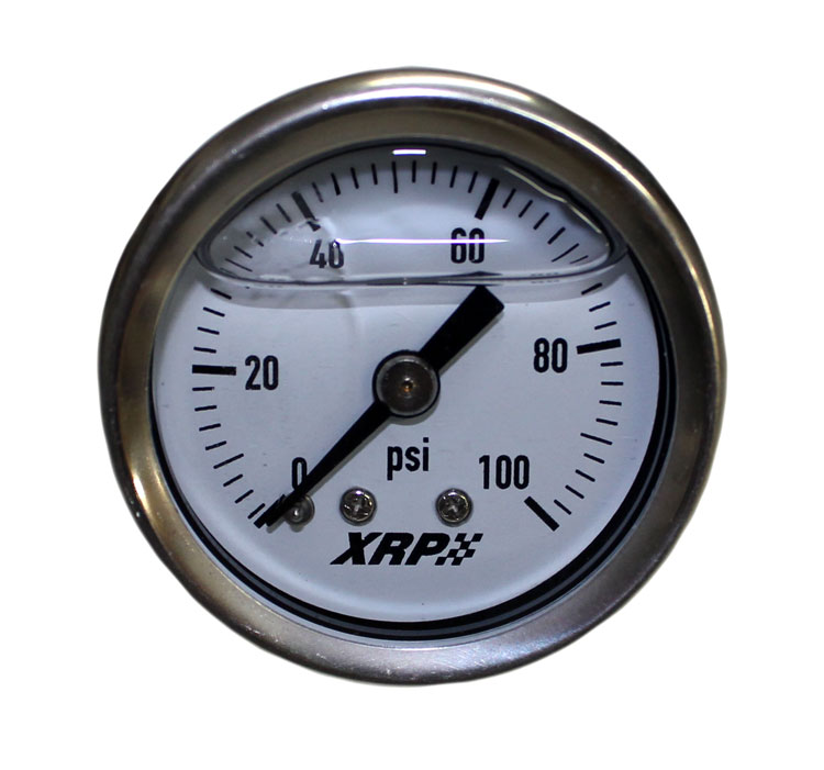 XRP Fuel Pressure Gauge, 0-15psi or 0-100psi, Liquid Filled or Dry, mechanical, 1-1/2 diameter in size with a 1/8″ NPT Port connection on the back.